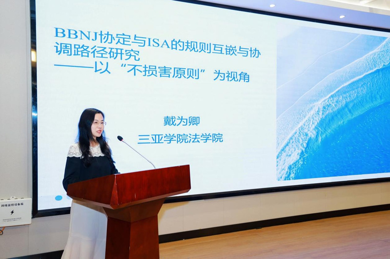 紧随其后,在议题三“全球海洋治理与合作的法律问题”的研讨中,我院教师海南自贸港海洋资源法治研究院副秘书长戴为卿登台发言。她的发言题目是《BBNJ协定与ISA的规则互嵌与协调路径研究—以“不损害”原则为视角》紧扣国际海洋法最前沿的动态。BBNJ(国家管辖范围以外区域海洋生物多样性)国际协定是近年来联合国框架下最重要的海洋法立法进程之一,而ISA(国际海底管理局)则负责管理“区域”内的矿产资源活动。戴为卿副秘书长精准地抓住了未来海洋治理中不同国际法律制度和机构间可能产生的规则交叉与潜在冲突这一核心问题,以经典的“不损害”原则为理论支点和分析工具,深入探讨了BBNJ协定与ISA现有规则体系如何实现有效衔接、互补与协同。